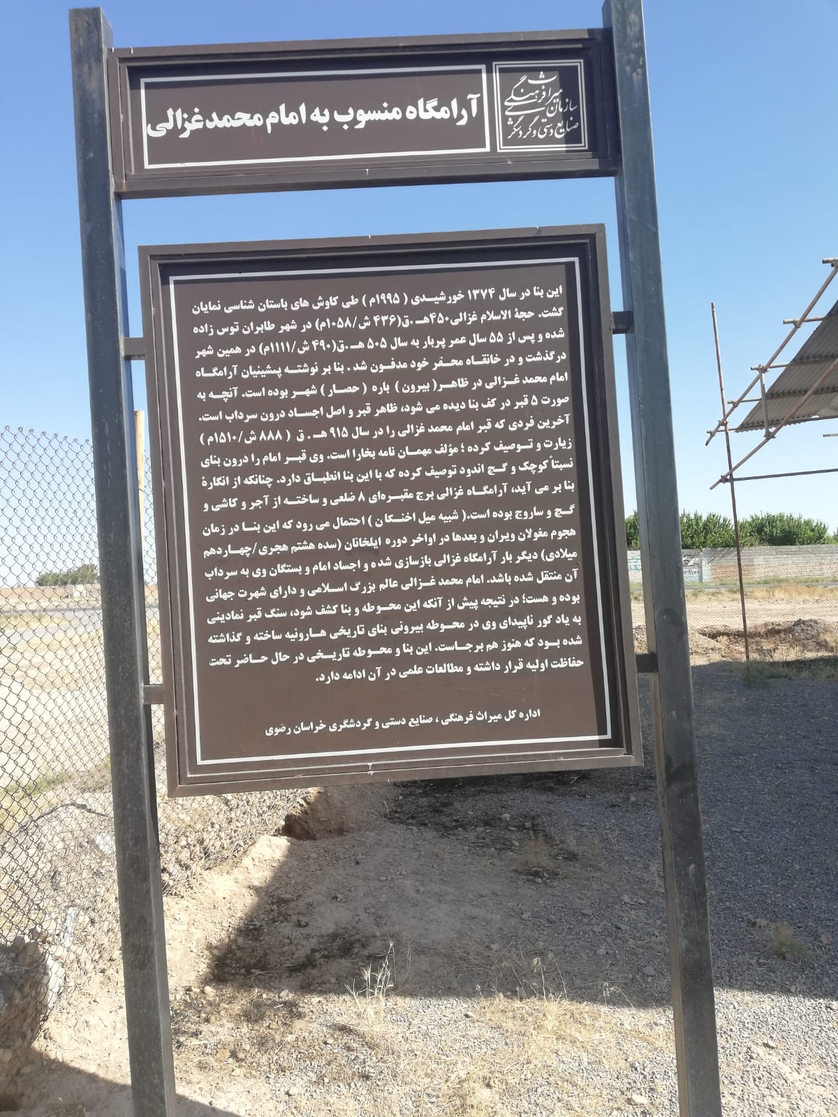 Bu yapı, 1374 (1995) yılında yapılan arkeolojik kazılar sırasında tanınmıştır. Hüccetü’l-İslâm Gazalî’nin (450–505 h.k./ 1058–1111 m.) Horasan’ın Tus şehrinde doğduğu, 55 yaşından sonra ömrünün sonuna kadar burada yaşadığı ve aynı şehirde kendi hanesinde defnedildiği anlaşılmıştır.